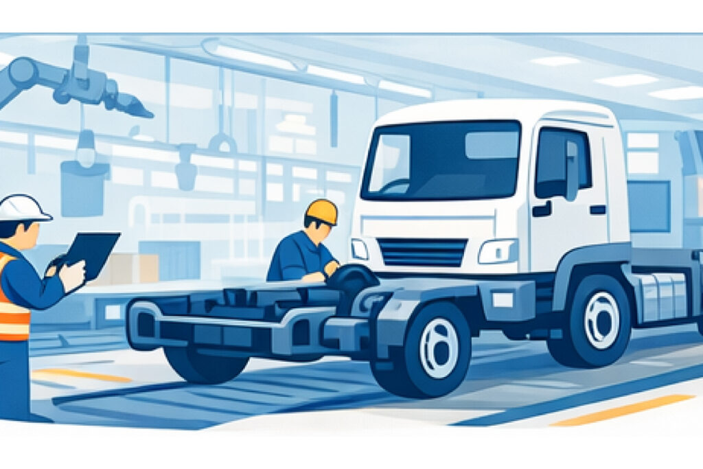 仕事は、大型トラックの製造ラインに関わる幅広い工程です。